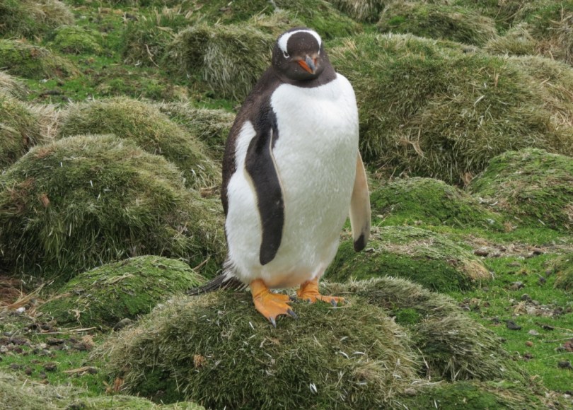 I had arranged a tour for four of us to see penguins before I left home. We were told to try to be on the first tender. We met in the Showroom at 7am. At 7:30am they gave us tickets for the 2nd tender. The first tender was used for an excursion that the ship arranged. The sea was rough and it took the tender 3 tries to tie up to the ship. After the tender was loaded, we headed toward town. It was so rough that water was pouring in the doorways. We finally got into town at 8:20am. We met the tour leader and he assigned us to Michael for our tour. The 4 of us got into t Michael’s 4x4s and we were off. We drove for 1 1/2 hours across the island to Bertha’s Cove. During the drive we learned about life on the island and the war with Argentina. There were 6 4x4s in our caravan that were all contracted through the same company. The beach they took us too was large with many Gentoo penguins. We were told that occasionally 2 King Penguins will be there but none were there today. We spent an hour wandering through the penguins. It was very windy and cold. A few times it rained. At the end of the hour we got hot coffee and cookies. We headed back toward Port Stanley. On the way we stopped and saw a black necked white swan. Near town there was a walk near Magellanic penguins. We started the walk and the wind got worse and there was icy rain. We saw some penguins in their burrows. Down on a beach below the walkway were a group of Gentoos. They looked frozen in place.
