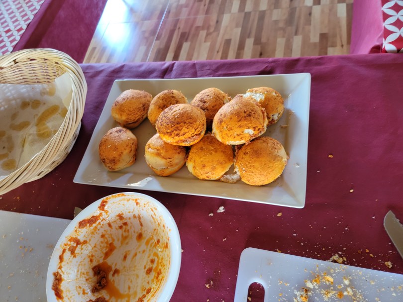 We got to pair up and make part of our lunch. Carolyn and I cut rolls and spread on tuna and tomato sauce. Others made salad, cheese tray with olive oil, and sangria. We then had lunch. It was very good.