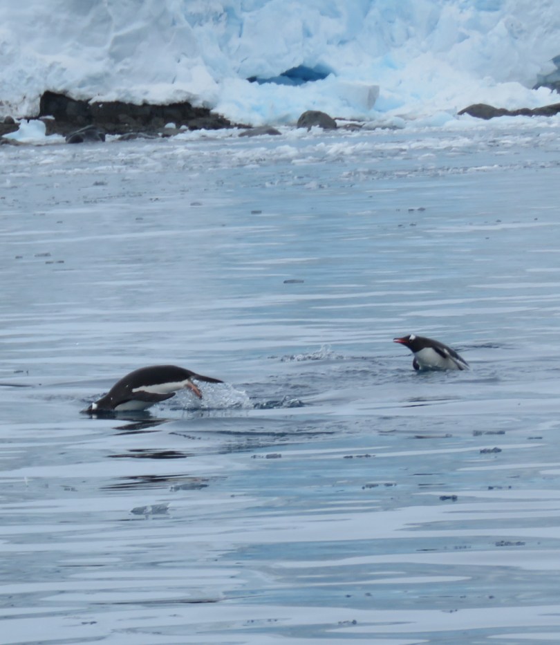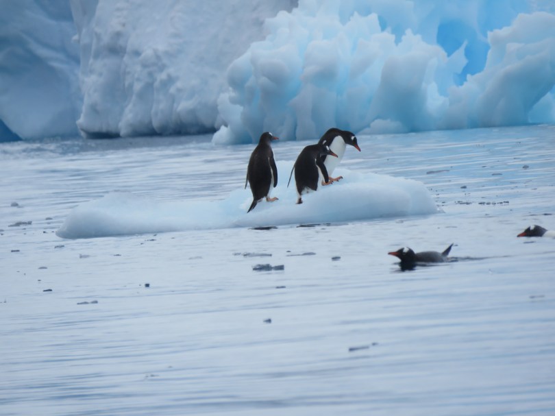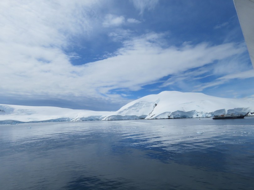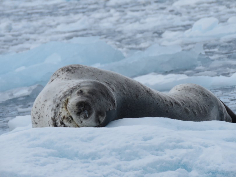 We sailed around an ice filled bay for over an hour. Kevin, our expedition guide, made sure gave us a detailed explanation of what we were seeing. We saw a young leopard seal lounging on an iceberg. Many of the icebergs that we saw were a beautiful blue. When the ice gets compacted over hundreds of years the blue shows because the air bubbles have been compressed out and the light reflects a blue color.