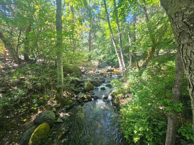 After a hearty breakfast, we walked downtown and hiked through Lithia Park. The park is very big. The treed paths take you past open green fields, play areas for children, tennis courts, and ponds. There are bridges to cross the creek which dissects the park. Children were keeping cool by playing in the creek. We sat by one pond and watched turtles sunning on the rocks and ducks floating by.