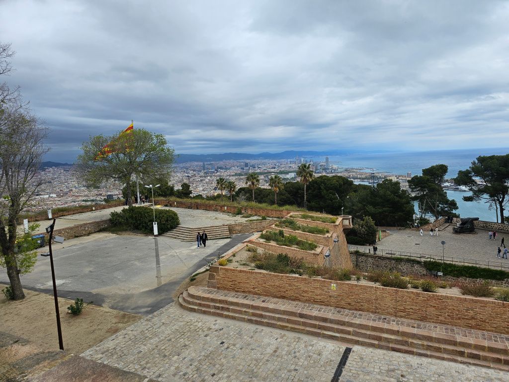 After a good breakfast at the local market, we walked to find the funicular to go up to Montjuiz. The top is the tallest point in the city. At the very top is a castle which was used to protect the city in the 1700’s. The funicular take you half way up. There are Cable Cars that you can take from the funicular to the castle. We decided to walk. It was a steep uphill. The view from the castle was worth it. You could see all of Barcelona. The way down was also steep. I didn’t bring my poles and my knee was complaining. We walked past the Olympic Stadium built for the 1992 Barcelona Olympics. We went into the Olympics Museum. It was very interesting. They told us we could go into the stadium so we walked back and went in. We were going to go to the Joan Miro museum but I was exhausted so we headed back to the apartment. But when we got down from the funicular, we decided to take the metro to Grill Thonet where we had lunch yesterday. Today we had tapas – Potatoes Bravas, Mussels marinara, grilled vegetables, and scallops. It was great! I forgot about my knee and we walked back to the apartment. Our total today was 8.5 miles.