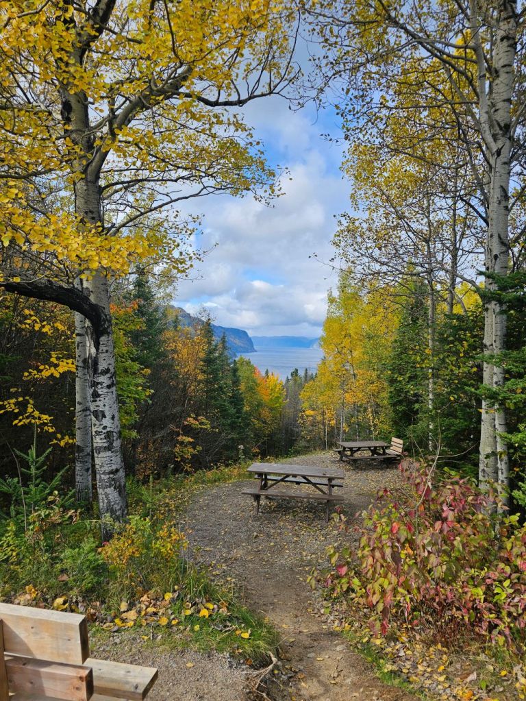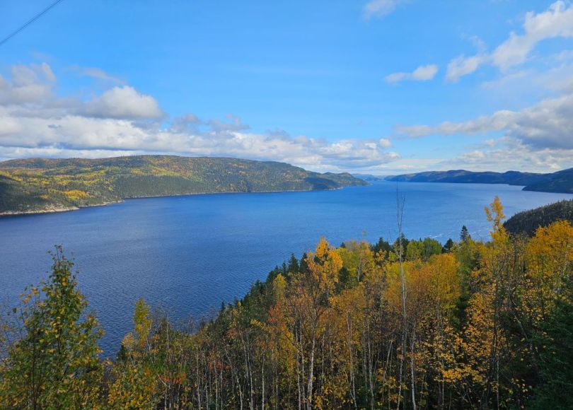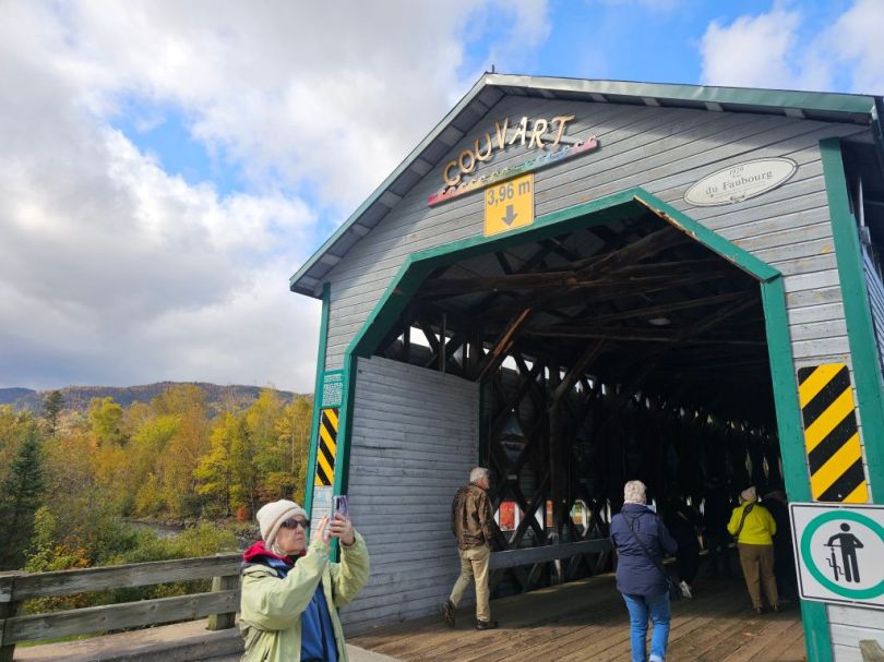 The boat portion of the trip ended in Anse St-Jean, a small village where we had lunch before boarding our bus. We stopped at a covered bridge over the Salmon River for pictures. We drove up hill to a series of platforms overlooking the Fjord. It was perfectly clear and a great view. When I was here 10 years ago, it was so foggy that we couldn’t see anything.